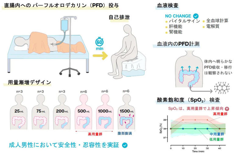 試験では、健康な成人男性27人をグループに分け、酸素を大量に溶かすことができ、目の手術などに使われる液体「パーフルオロデカリン(PFD)」を異なる用量で投与。1時間後に排せつしてもらった。