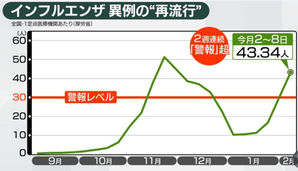 「インフルエンザが異例の再流行となっています。去年11月に大きな流行があった後、一度落ち着いたものの、2度目の急上昇をしています。厚生労働省によると、2月8日まで2週連続で警報レベルを超えています(1定点医療機関あたりの患者数は43.34人)」