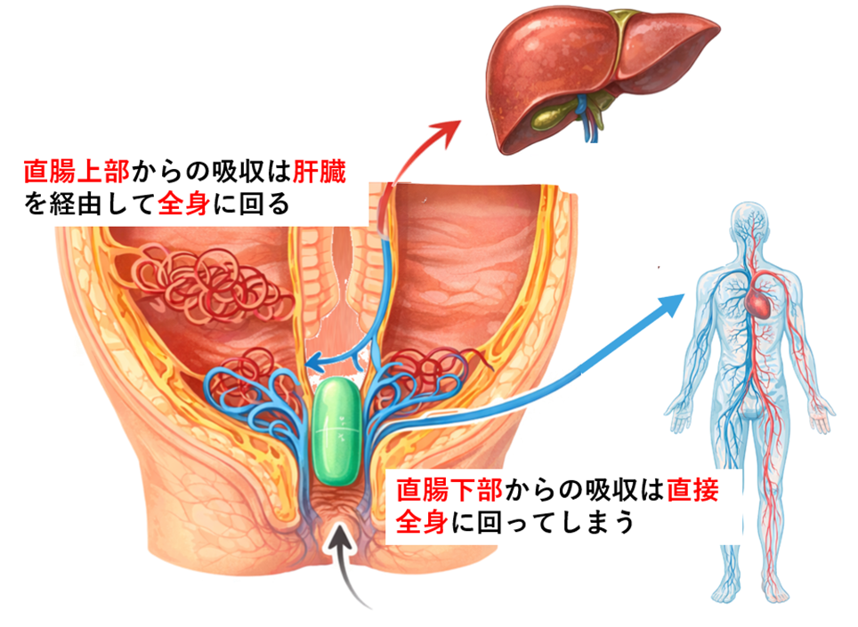さらに、直腸から吸収された薬の一部は肝臓での初回通過効果を回避できるため、内服より効きが安定することもあります。