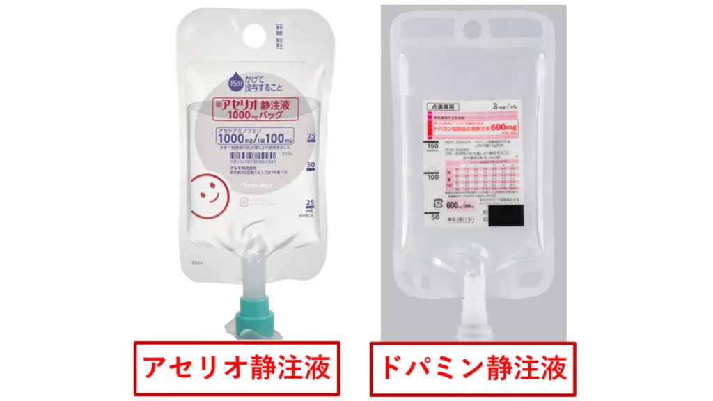 アセリオもドパミンも樹脂製の点滴バッグに入っており、外観が似ていたと報じられています。暗い照明や急いでいる状況では、パッケージの微妙な違いを見落としやすくなります。薬剤の外観類似性は、医療現場における取り違え事故の代表的な要因の一つです。