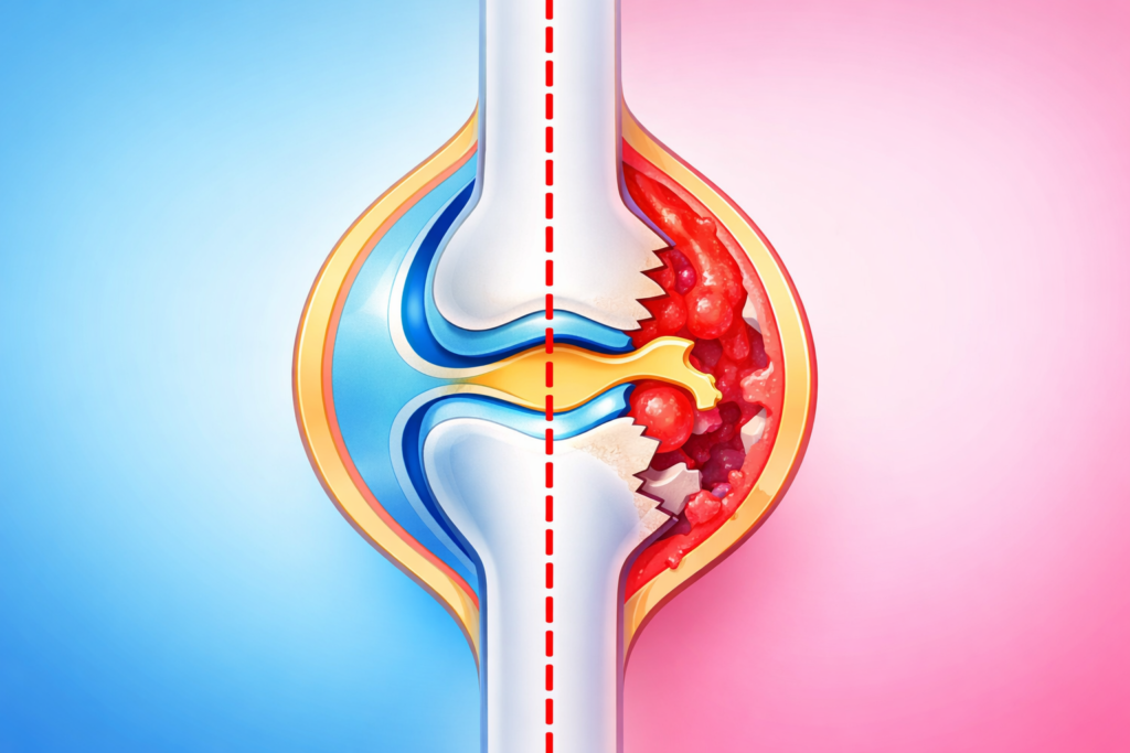その結果、関節の腫れや痛みが慢性的に続き、進行すると骨や軟骨が破壊され、関節の変形や機能障害を起こすことがあります。